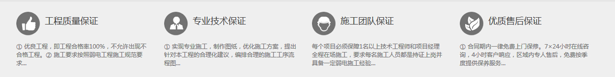 優(yōu)質(zhì)售后保證:① 合同期內(nèi)一律免費(fèi)上門保修。7×24小時(shí)在線咨詢,4小時(shí)客戶響應(yīng),區(qū)域內(nèi)專人售后,免費(fèi)按季度提供保養(yǎng)服務(wù)。② 我司承諾對所承做的工程負(fù)責(zé)5年跟蹤維修質(zhì)保服務(wù)。③ 我司有備用器材,對一時(shí)不能修復(fù)的器材我司可先換公司備用器材,做到不影響客戶使用,贏得用戶口碑是我們的追求。
